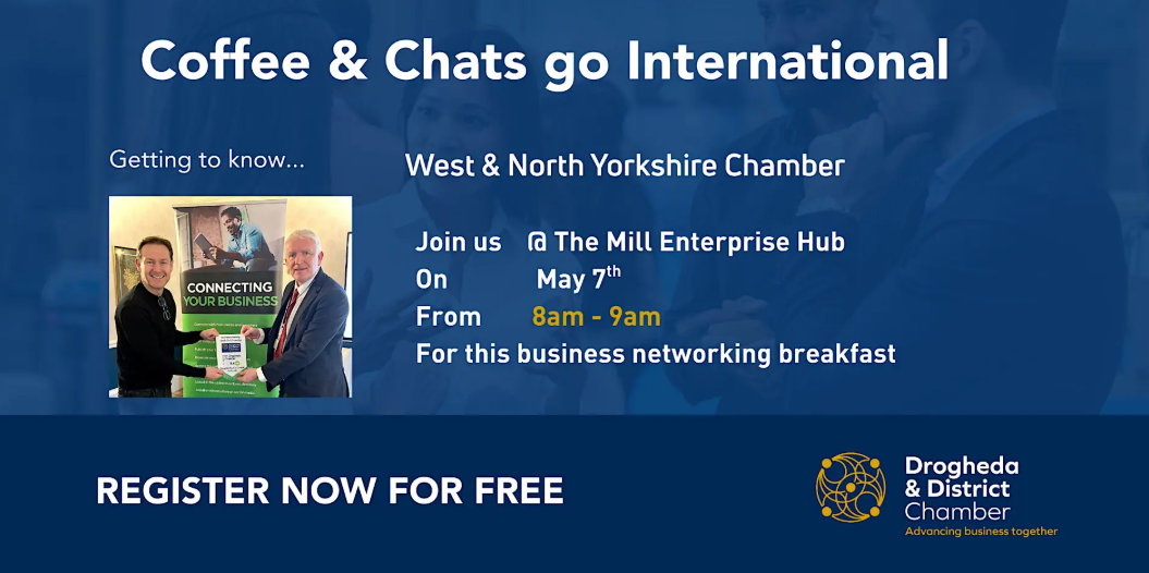 Enjoy a morning in the company of the CEO of West and North Yorkshire Chamber of Commerce, James Mason, and learn about the links and business opportunities being established between the Drogheda region and WNY, including areas like Leeds, Bradford, York, Huddersfield and Halifax.